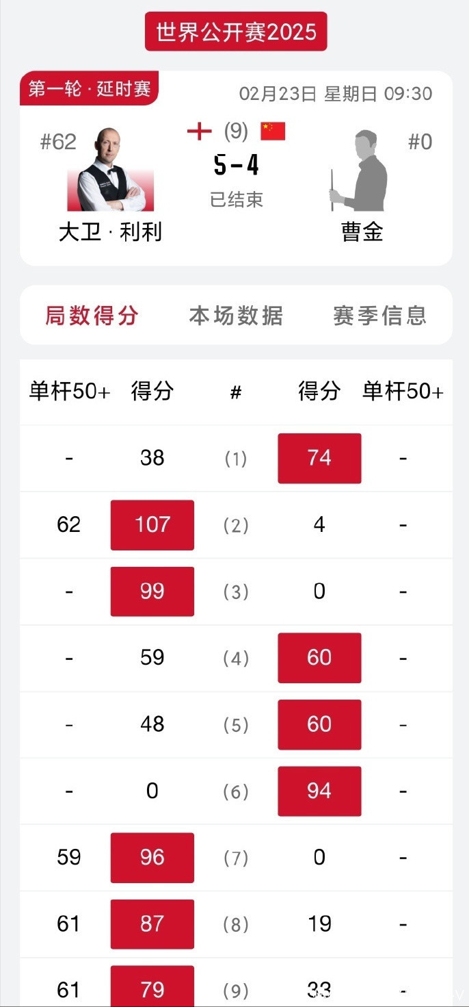 来到斯诺克天下公开赛,曹金再次持外卡参赛,他在第一轮的敌手是元老世锦赛冠军大卫-利利。此役,曹金以74-38开局,敌手连扳两局2-1反超比分,曹金轰出一波3连鞭。