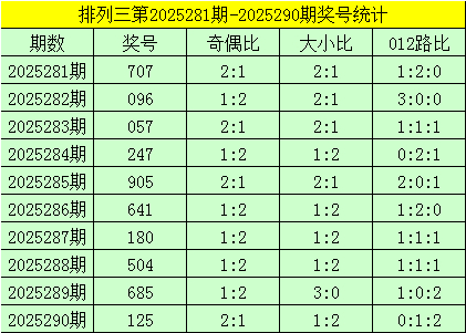 开奖回来:成列三第2025290期奖号为:125,其奇偶比为2:1,大小比为1:2,奖号012路比为0:1:2。